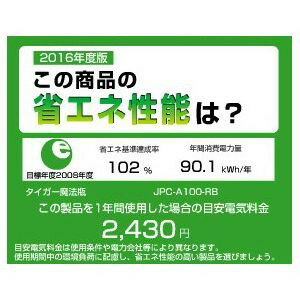 機種名 JPC-A100RB 色柄 (RB)バーガンディ 本体サイズ(約)(幅×奥行き×高さ) 25.2×30.2×21.1cm 本体質量(約) 5.4kg 容量 0.18?1.0L(1?5.5合) 最大消費電力 1200W 年間消費電力量(※1) 90.1kWh/年 1回当りの炊飯時消費電力量(※1) 177Wh(※2) 1時間当りの保温時消費電力量(※1) 17.3Wh(※2) 省エネ基準達成率 102% 電源 100V 50/60Hz 加熱方式 可変W圧力IH + 剛火IH + 釜包みIH 内なべ 熱流&熱封土鍋コーティング、9層遠赤特厚釜(なべ厚3mm)、内なべ遠赤、 内なべ洗米OK、とっ手つき、内なべ3年保証 メニュー エコ炊き*・白米*(おこげ選択)・極うま*・早炊き*・炊込み*(おこげ選択)・おかゆ*・玄米・GABA増量・麦めし*・雑穀米*・おこわ・調理 付属品 自立式しゃもじ、計量カップ ※1 省エネ法・特定機器「電気ジャー炊飯器」の測定方法による数値です。
