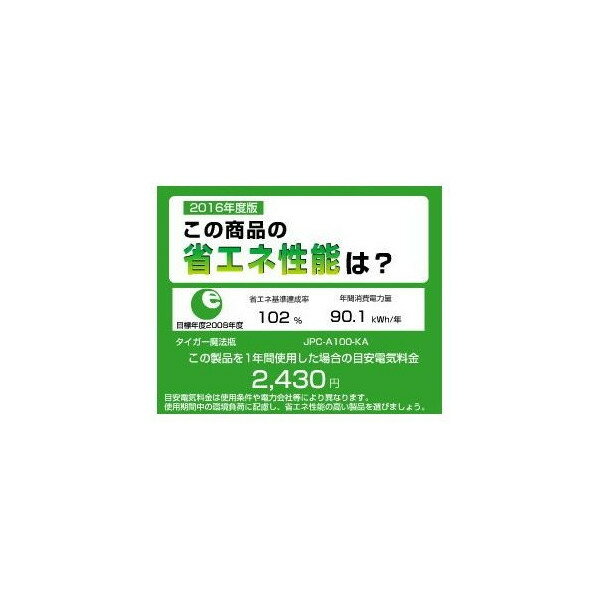 機種名 JPC-A100KA 色柄 (KA)ブルーブラック 本体サイズ(約)(幅×奥行き×高さ) 25.2×30.2×21.1cm 本体質量(約) 5.4kg 容量 0.18?1.0L(1?5.5合) 最大消費電力 1200W 年間消費電力量(※1) 90.1kWh/年 1回当りの炊飯時消費電力量(※1) 177Wh(※2) 1時間当りの保温時消費電力量(※1) 17.3Wh(※2) 省エネ基準達成率 102% 電源 100V 50/60Hz 加熱方式 可変W圧力IH + 剛火IH + 釜包みIH 内なべ 熱流&熱封土鍋コーティング、9層遠赤特厚釜(なべ厚3mm)、内なべ遠赤、 内なべ洗米OK、とっ手つき、内なべ3年保証 メニュー エコ炊き*・白米*(おこげ選択)・極うま*・早炊き*・炊込み*(おこげ選択)・おかゆ*・玄米・GABA増量・麦めし*・雑穀米*・おこわ・調理 付属品 自立式しゃもじ、計量カップ ※1 省エネ法・特定機器「電気ジャー炊飯器」の測定方法による数値です。